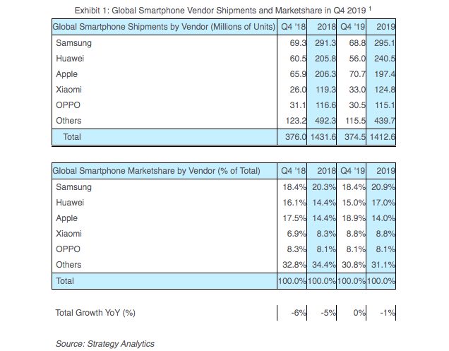 Du côté de Samsung, 68,8 millions de smartphones ont été vendus par le sud-coréen au cours des trois derniers mois de 2019, en comparaison aux 69,3 millions d’exemplaires écoulés au cours des trois derniers mois de l’année 2018 ; une baisse de moins d’1 pour cent.