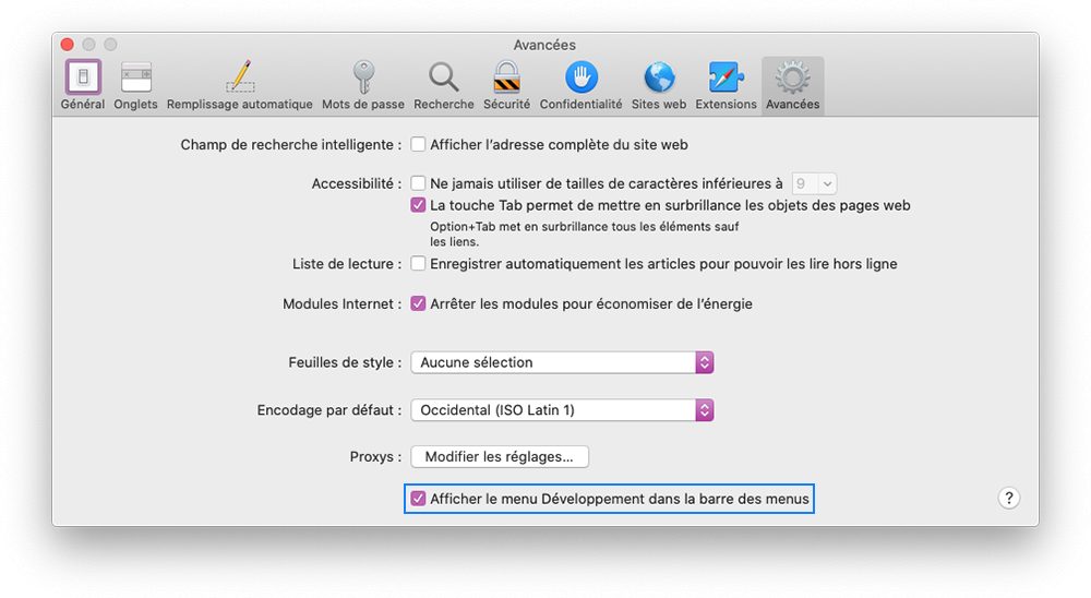 3.3. Dans l’onglet Avancées, cochez, tout en bas, Afficher le menu Développement dans la barre des menus ;