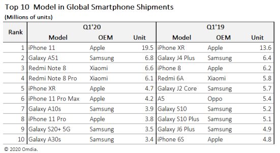 Le cabinet indique que 19,5 millions d’iPhone 11 ont été vendus au cours du premier trimestre de 2020, en comparaison à 13,6 millions d’exemplaires pour l’iPhone XR l’année dernière à la même période. L’iPhone 11 a donc été le smartphone le plus populaire sur la période.