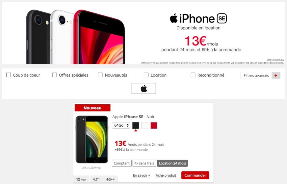 L’iPhone SE 2020 (noir, blanc ou rouge) est proposé en location par Free Mobile. Le consommateur sera payera 69 euros au moment de passer la commande et ensuite il devra payer 13 euros par mois pendant 24 mois pour le modèle avec 64 Go d’espace de stockage.