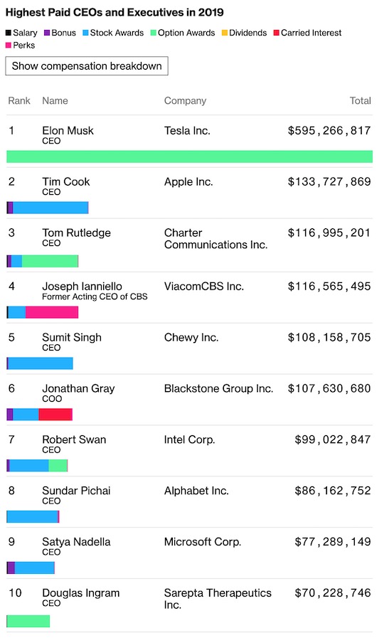 Bloomberg a partagé le Pay Index de 2019, c’est un classement de la rémunération des dirigeants américains. Il se trouve que le PDG d’Apple, Tim Cook, est le deuxième PDG qui est le mieux payé après Elon Musk, le PDG de Tesla.