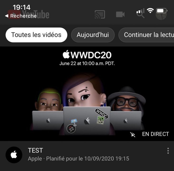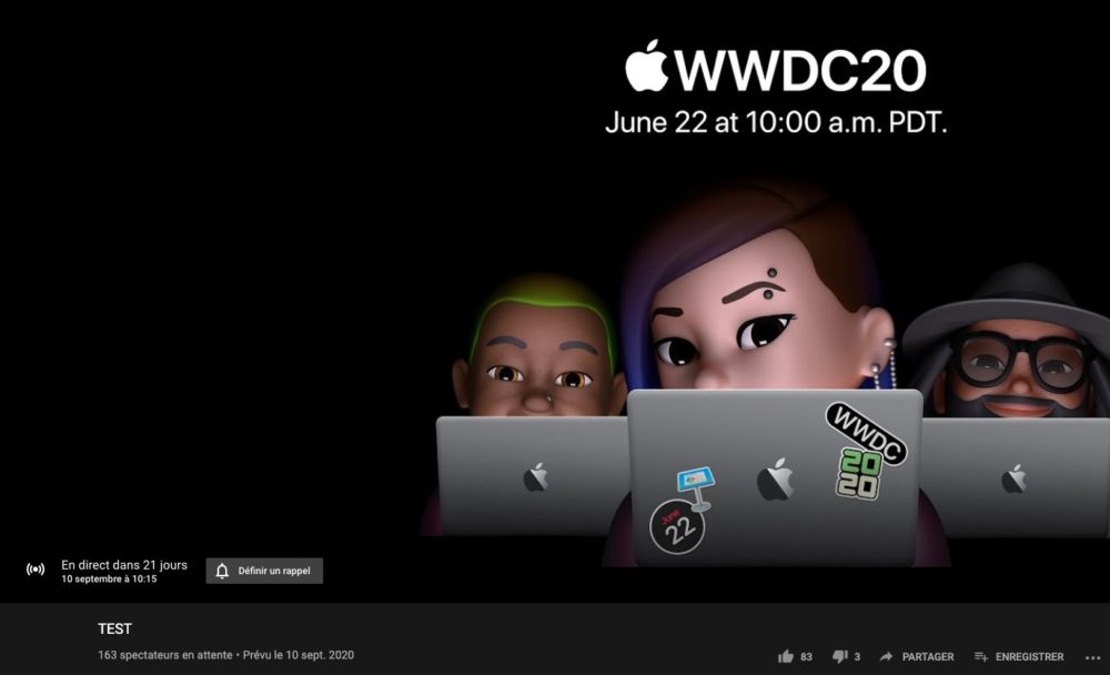 Apple a programmé une vidéo en direct sur YouTube pour le 10 septembre à 19h15 puis l’a rapidement retirée après sa publication. Le titre de la vidéo était simplement « TEST » et avait pour image celle de la WWDC 2020. La date du 10 septembre pourrait être la date de la prochaine keynote d’Apple où la firme présentera ses iPhone 12 ainsi que d’autres produits. Mais, le 10 septembre cette année sera un jeudi (et ce jour est un jour rare pour qu’Apple organise une keynote), outre la firme a annoncé que la disponibilité de l’iPhone 12 sera repoussée « de quelques semaines » ; ainsi ces deux choses font croire que la date du 10 septembre n’est pas certaine. Toutefois, nous n’avons qu’à patienter…