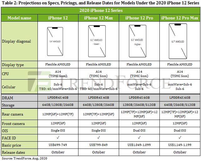 Le site a déclaré que le prix des iPhone 12 Pro serait plus élevé que celui des iPhone 11 Pro. TrendForce pense que le prix de départ de l’iPhone 12 de 5,4 pouces serait placé entre 699 et 749 dollars ; l’iPhone 11 a un prix de démarrage de 699 dollars. Et l’iPhone 12 de 6,1 pouces de son côté aurait un prix de départ situé entre 799 et 849 dollars.