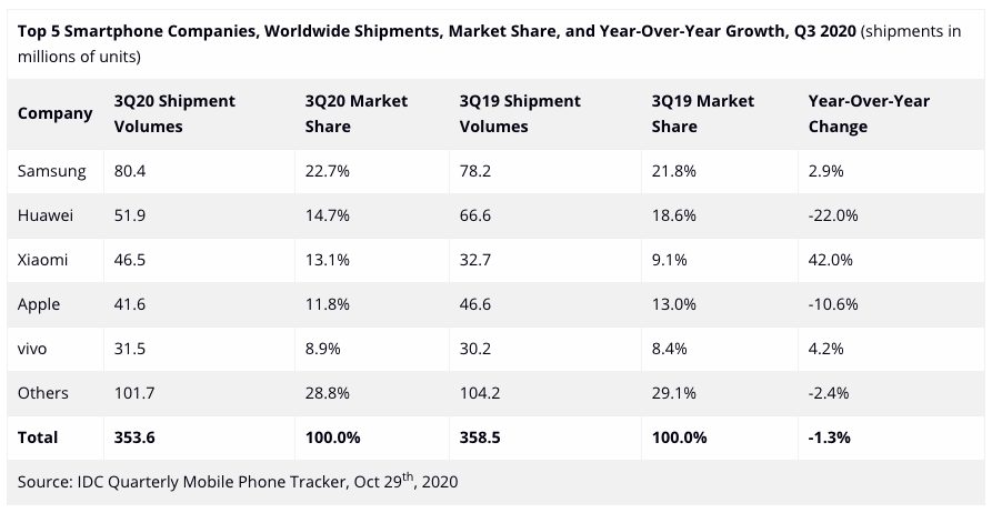 Les données publiées par le cabinet IDC montrent qu’Apple a vendu 41,6 millions d’iPhone au cours du troisième trimestre de 2020, comparés aux 46,6 millions vendus l’année dernière à la même époque ; on remarque alors une chute de 10,6% avec une part de marché à 11,8%, contre de 13% auparavant.