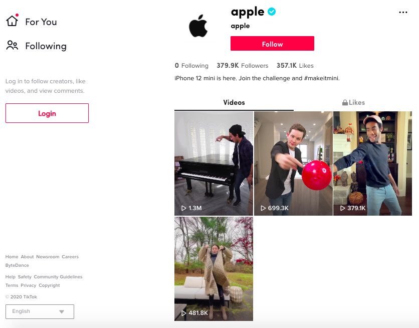 Apple a créé son compte TikTok officiel il y a plus de six mois maintenant (voir : Apple a désormais un compte TikTok officiel, mais n’a pas encore publié de vidéo), cependant la société n’avait jamais mis en ligne aucune vidéo jusqu’ici. Apple, en ce moment, profite du compte pour faire l’éloge de l’iPhone 12 mini.