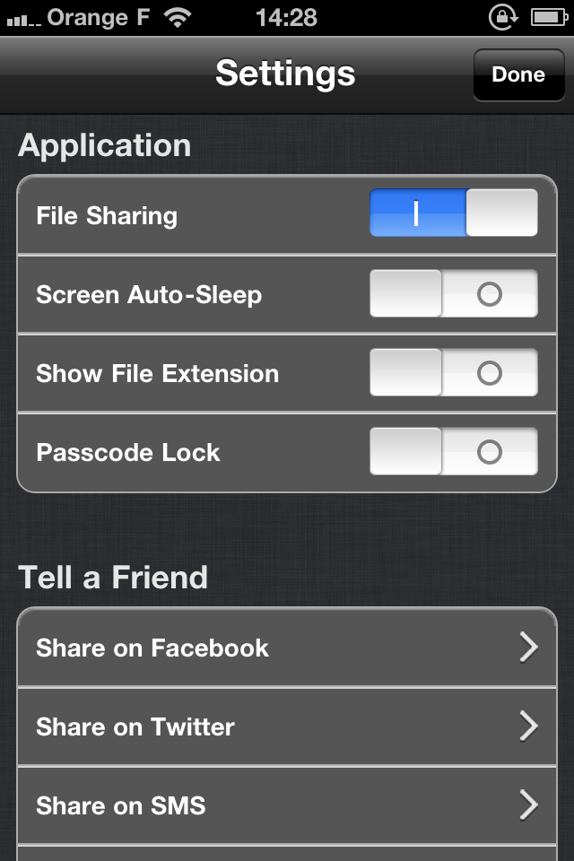 Le bouton « settings » vous offre plusieurs réglages. Vous pouvez ainsi activer ou non le partage de fichiers, mette l’application en mode veille automatique, montrer ou non l’extension des fichiers ou encore attribuer un mot de passe.