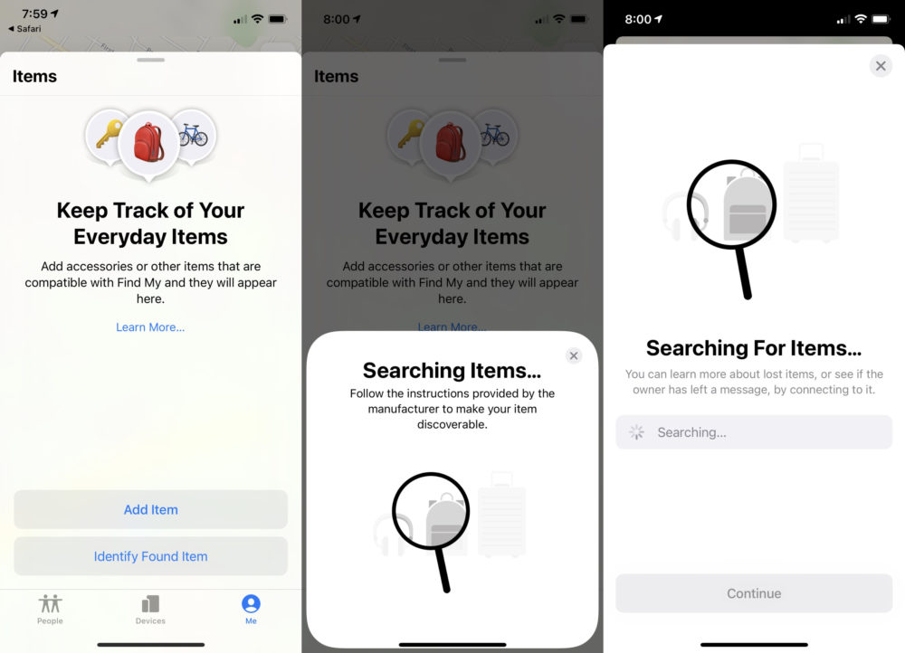 Pour le découvrir, vous devez vous rendre sur Safari et taper findmy://items dans la barre URL. Cela vous permettra d’activer une nouvelle section dans l’application Localiser pour la recherche des objets. L’application Localiser sur votre iPhone va s’ouvrir et la nouvelle section dédiée aux AirTags va apparaître. Appuyez alors sur le bouton Add item ou « Ajouter un objet » en français et l’iPhone va tenter de trouver des accessoires ou autres choses compatibles. Mais cette recherche ne donnera aucun résultat, sachant que les AirTags ne sont pas disponibles.