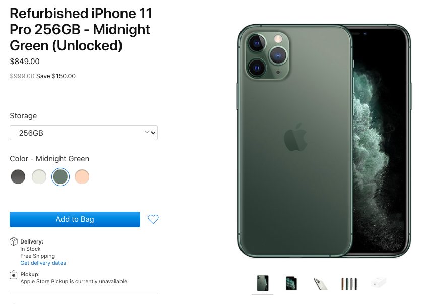 Par conséquent, Apple propose l’iPhone 11 reconditionné uniquement en noir avec 128 Go d’espace de stockage (pour l’instant ?). De son côté, l’iPhone 11 Pro est proposé en vert nuit et en gris sidéral avec 64, 256 et 512 Go de stockage ; presque le même scénario pour l’iPhone 11 Pro Max. En ce qui concerne les réductions, elles peuvent être soit de 100, de 140, de 150, de 170, de 180 ou 200 dollars ; tout dépend du modèle et du stockage sélectionné.