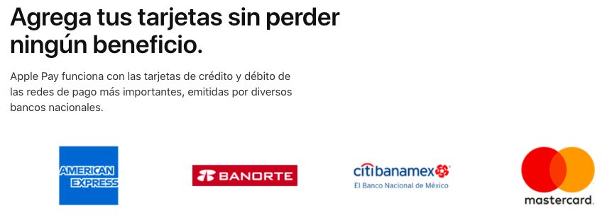 Au lancement, le service de paiement sans contact d’Apple, Apple Pay, est proposé seulement par deux banques au Mexique. Ces deux banques en question sont : Citibanamex et Banorte. Outre, toutes les cartes ne sont pas compatibles ; celles qui sont compatibles sont : American Express et MasterCard. Il est indiqué par les banques qui proposent Apple Pay que le support des cartes Visa est pour plus tard.