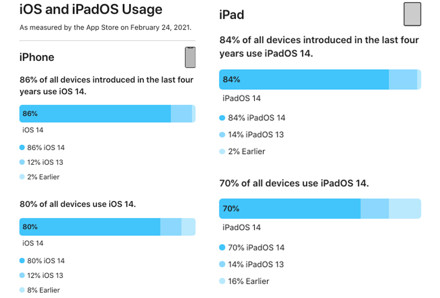 Apple a annoncé l’actuelle part d’installation d’iOS 14 (sur iPhone) et celle d’iPadOS 14 (sur iPad). Selon les nouveaux chiffres qui sont publiés par la société, iOS 14 est installé sur 80% des iPhone et iPadOS, sur 70% des iPad.