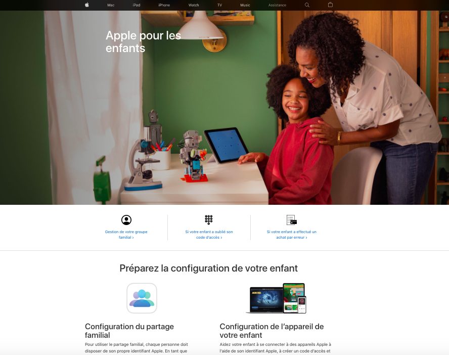 Une nouvelle section est disponible sur le site d’Apple. Nommée « Apple pour les enfants », elle est dédiée aux parents. Dans cette nouvelle section, Apple explique aux parents comment configurer un appareil afin de le donner à leurs enfants. Outre, la page dispose d’autres explications.