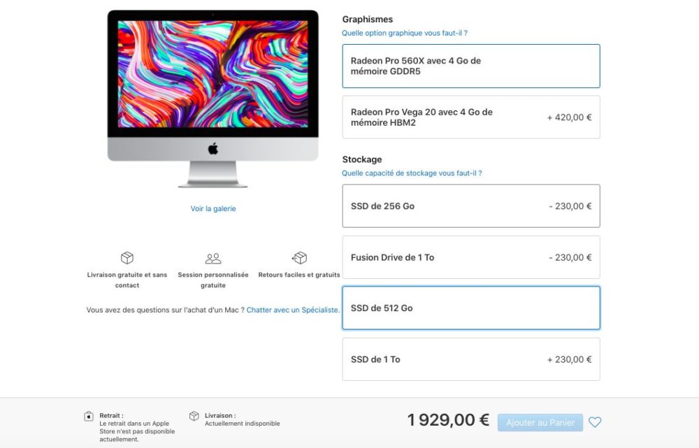 À la suite de la suppression totale de l’iMac Pro sur l’Apple Store en ligne, il paraît que l’iMac 21,5 pouces avec un écran Retina 4K soit le prochain à être abandonné par Apple. Car Apple vient d’abandonner les options 512 Go et 1 To de stockage SSD de l’iMac 21,5 pouces et ne sont plus affichées sur son site.
