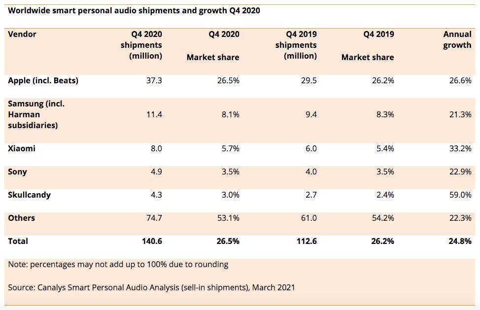 Le quatrième trimestre de l’année 2020 est la période où Apple a connu la forte croissance. En effet, le constructeur a pu vendre 37,3 millions d’écouteurs (AirPods et Beats). Avec ces ventes, le Californien a eu une part de marché de 26,5% et la hausse sur une année est de 26,6% ; Apple a donc vendu plus d’écouteurs au Q4 2020 que tous les autres constructeurs.