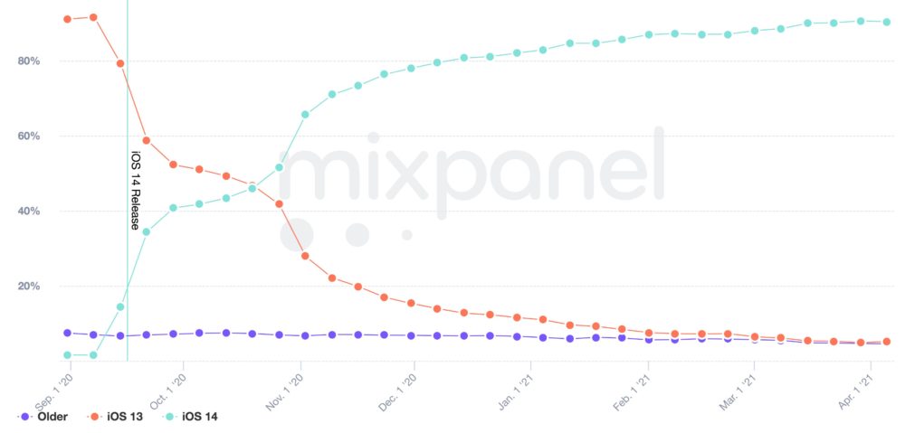 Apple a indiqué que la version d’iOS 14 est installée sur 80% des iPhone et la version d’iPadOS, sur 70% des iPad ; c’était en février dernier. Pour ce mois d’avril, les données de Mixpanel indiquent que le taux d’adoption d’iOS 14 est désormais de 90%. Toujours selon le cabinet, le taux d’adoption d’iOS 13 est de 5,05%, celle d’iOS 12 et les versions antérieures est de 4,48%. Il est bon de mentionner que Mixpanel collecte ces informations à partir d’une combinaison d’analyses de pages web et d’applications mobiles utilisées par des millions d’appareils.