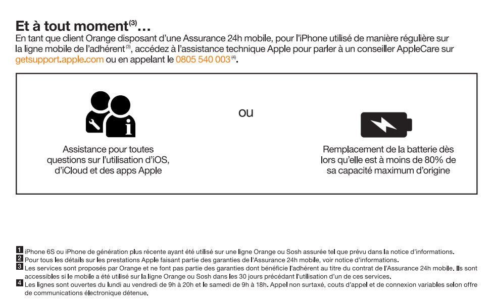 D’un autre côté, Orange annonce que vous aurez la possibilité d’appeler un conseiller AppleCare si vous voulez recevoir de l’assistance ou encore pour demander de changer la batterie de votre iPhone quand elle est à moins 80% de sa capacité maximum d’origine.