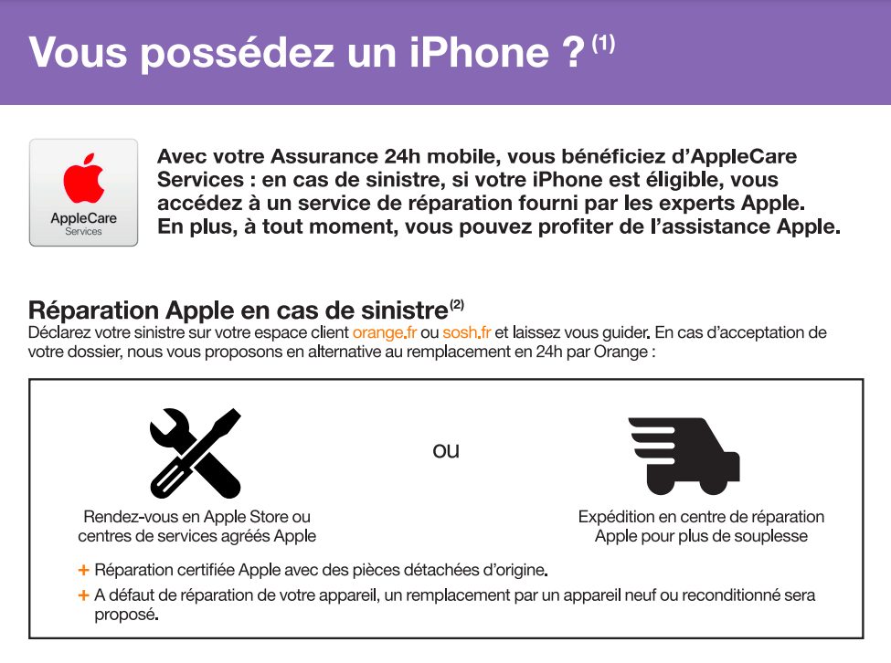 « Avec votre Assurance 24h mobile, vous bénéficiez d’AppleCare Services : en cas de sinistre, si votre iPhone est éligible, vous accédez à un service de réparation fourni par les experts Apple. En plus, à tout moment, vous pouvez profiter de l’assistance d’Apple », a écrit Orange.