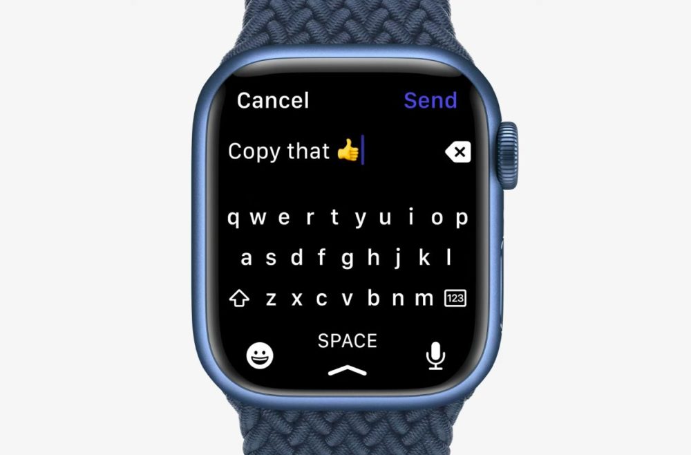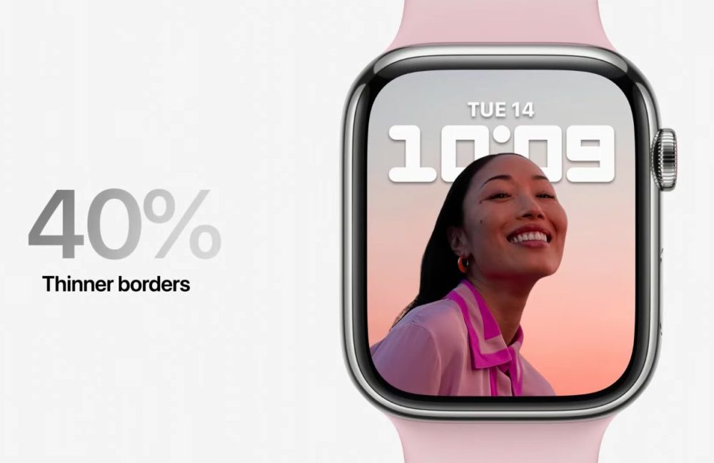 La nouvelle montre est équipée d’un boîtier et d’un écran qui ont des coins plus doux et plus arrondis. Grâce au nouvel écran plus grand, Apple propose désormais un clavier complet pour la saisie de texte. Ce nouvel écran plus grand permet d’avoir beaucoup plus de contenu et dispose des bords qui montrent des cadrans avec des détails sur les côtés. La dalle OLED de la nouvelle montre est 70% plus lumineuse que la Series 6 et permet une utilisation bien meilleure en intérieur (et également en extérieur). Les bordures de l’écran de l’Apple Watch Series sont plus petites que celles de la Series 6 et sont donc réduites à 1,7 millimètre ; les bordures sont 40% plus fines que sur l’Apple Watch Series 6.
