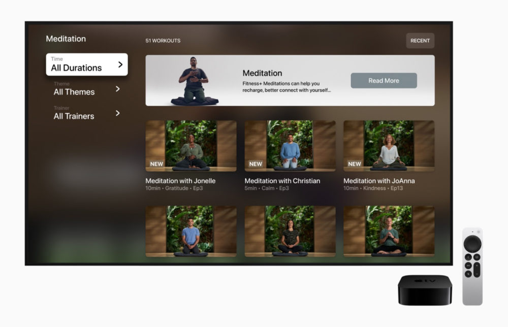 Apple proposera également la méditation guidée. Ces entraînements seront là pour aider les utilisateurs à réduire le stress quotidien, à développer un plus grand sens de la conscience et à renforcer la résilience. Les utilisateurs seront en mesure de choisir parmi neuf thèmes de méditation guidée – Objectif, Bonté, Gratitude, Conscience, Créativité, Sagesse, Calme, Concentration et Résilience – pour une expérience vidéo captivante aux côtés des entraîneurs Fitness+. La durée de chaque séance sera de 5, 10 ou de 20 minutes.