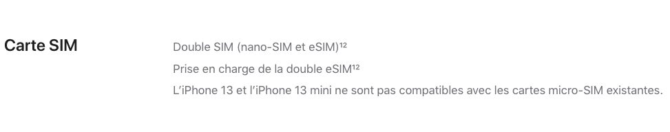 Le support de la double eSIM est proposé par Apple avec les iPhone 13, 13 mini, 13 Pro et 13 Pro Max. Cette information peut être retrouvée sur la fiche technique des iPhone 13/13 mini et des iPhone 13 Pro/13 Pro Max.