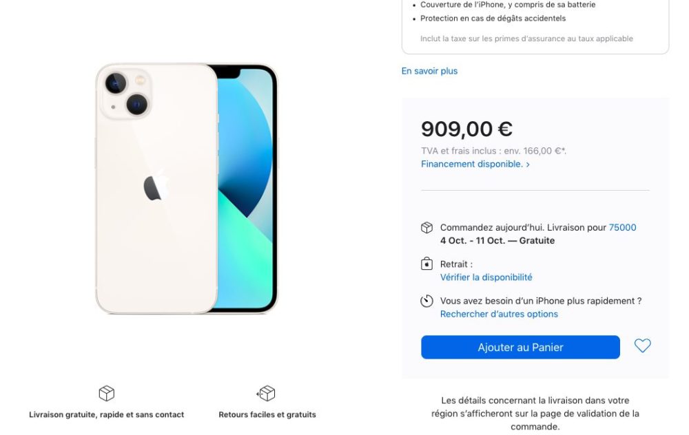 Ce retard touche tous les iPhone 13 de 128 Go de stockage (c’est-à-dire tous les coloris en 128 Go : rose, bleu, minuit, lumière stellaire et PRODUCT(RED)) ; un exemplaire commandé aujourd’hui arrivera entre le 4 et le 11 octobre. De leur côté, les autres versions de l’iPhone 13 et l’iPhone 13 mini ne sont pas touchés par ce retard de livraison ; un exemplaire commandé aujourd’hui arrivera le 24 octobre prochain.