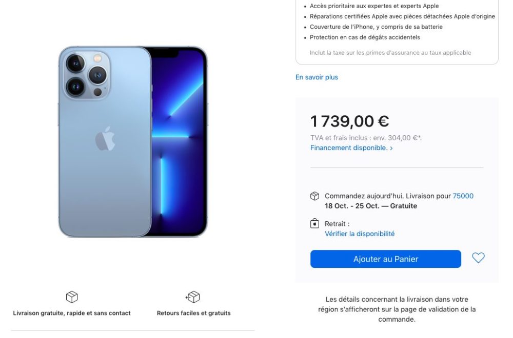 Du côté de l’iPhone 13 Pro et de l’iPhone 13 Pro Max, toutes les couleurs et toutes les capacités de stockage affichent une date de livraison de plus d’un mois ; la livraison se fera donc entre 18 et 25 octobre. Ces dates de livraison peuvent varier ; nous les avons vérifiées au moment de la rédaction de l’article.