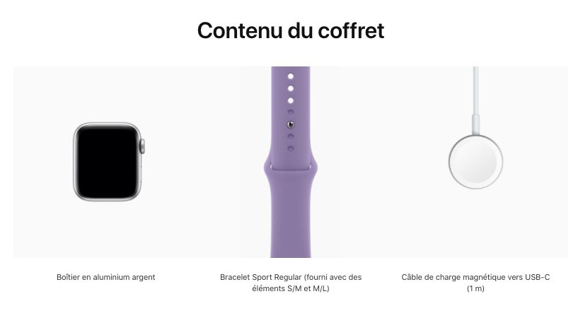 Il y a un changement au niveau du contenu du coffret de l’Apple Watch SE. En effet, la montre arrive à présent avec un câble de charge magnétique vers USB-C dans la boîte. Antérieurement, Apple livrait l’Apple Watch SE avec un câble de charge magnétique vers USB-A.