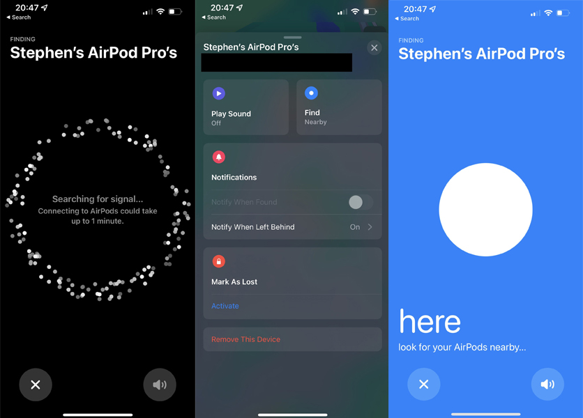 Cela signifie donc que les AirPods Pro et les AirPods Max acquièrent de nouvelles fonctionnalités dans l’application Localiser. Ainsi, il serait notamment possible à l’utilisateur de connaître l’emplacement précis de ses AirPods, d’avoir une nouvelle interface utilisateur de recherche à proximité, le mode perdu et la possibilité de recevoir des notifications lorsqu’il s’éloigne de ses écouteurs.