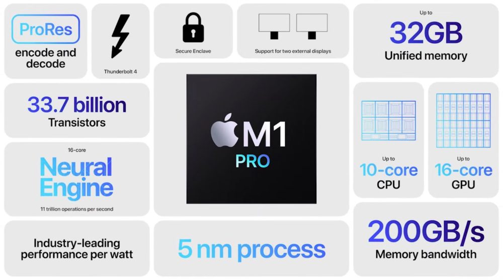 - 57 milliards de transitions (1,7x plus que la puce M1 Pro et 3,5x que la puce M1)