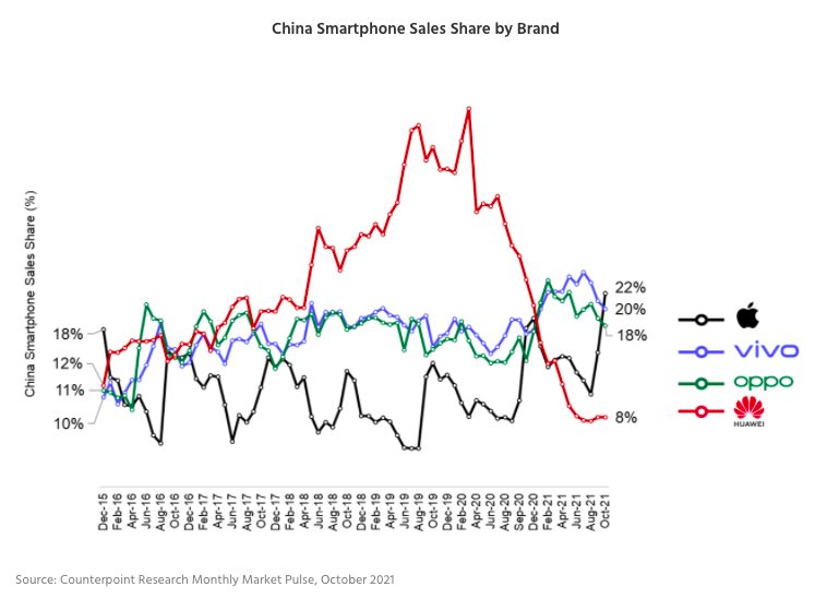 Il est bon de mentionner qu’Apple a fait un grand pas. Durant les mois juin, juillet et août 2019, le constructeur occupait difficilement 5% de la part du marché des smartphones en Chine. Toujours selon Counterpoint, Apple aurait pu gagner plus s’il n’y avait pas de grosses pénuries de composants au cours de ces derniers mois. D’un autre côté, nous pouvons voir la chute remarquable de Huawei sur une période d’un an.