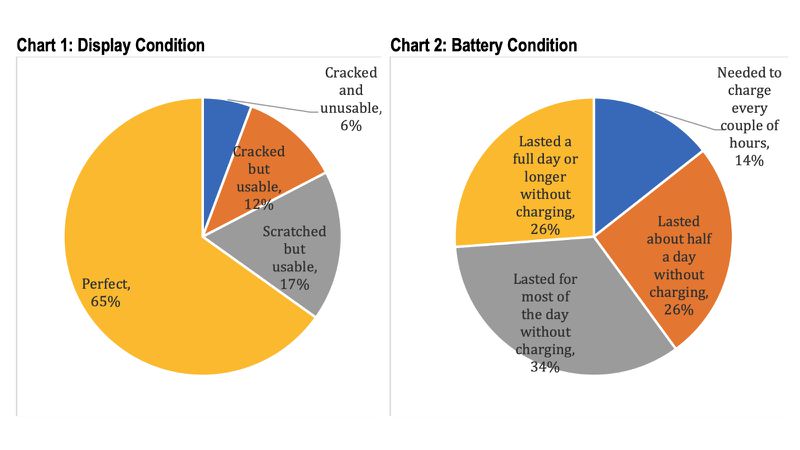 Les résultats de l’étude menée par le cabinet CIRP suggèrent que presque tous les iPhone qui sont en cours d’utilisation ont un écran en état dit « utilisable » et la plupart des iPhone ont également une batterie dite « utilisable ». 12% des écrans d’iPhone sont fissurés, mais utilisables, et seulement 6% sont inutilisables et doivent être remplacés. Toujours selon l’étude, 26% des batteries d’iPhone offrent une autonomie d’une demi-journée avec une seule charge et 14% doivent être rechargées toutes les deux heures. Par conséquent, le remplacement de la batterie est donc susceptible d’être parmi les réparations les plus courantes, mais relativement peu d’appareils actifs ont besoin de remplacer l’une ou l’autre de ces pièces qui sont soumises à un niveau élevé d’usure.