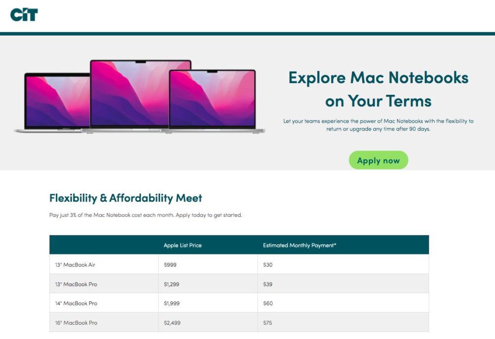 Apple a fraîchement dévoilé un nouveau programme, avec un financement en passant par un tiers certifié, qui va offrir aux entreprises la possibilité de mettre à jour leur MacBook. C’est avec CIT que le Californien a fait partenariat pour que les entreprises puissent recevoir un MacBook pour 30 dollars par mois avec la facilité de le mettre à niveau après 3 mois si un nouveau modèle sort.