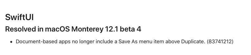 D’après les notes de la bêta 4 de macOS 12.1 publiées par Apple, nous voyons que la firme indique qu’elle a proposé un correctif au niveau de SwiftUI. Apple écrit que : « Les applications basées sur des documents ne comportent plus d’élément de menu « Enregistrer sous » au-dessus de « Dupliquer. »