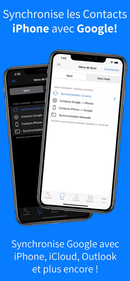 Avec cette application, vous pouvez synchroniser rapidement et facilement vos contacts Google et iPhone, vous donnant ainsi accès à vos contacts où que vous alliez. Cette application se distingue par sa fiabilité, sa facilité d’utilisation, sa vitesse et une véritable «synchronisation bidirectionnelle» qui fusionne les modifications apportées à vos contacts Gmail et iPhone.