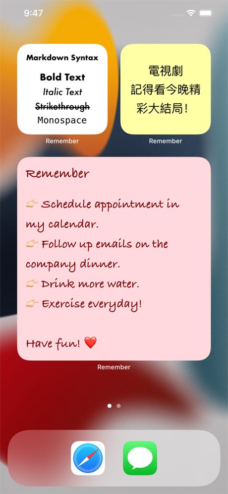 Meilleure application de stickies pour iPhone et iPad ! Instructions : sélectionnez une page à écrire et à concevoir, sélectionner le texte et la couleur d’arrière-plan, modifier la police et l’alignement du texte, ajouter des widgets à afficher sur l’écran d’accueil.