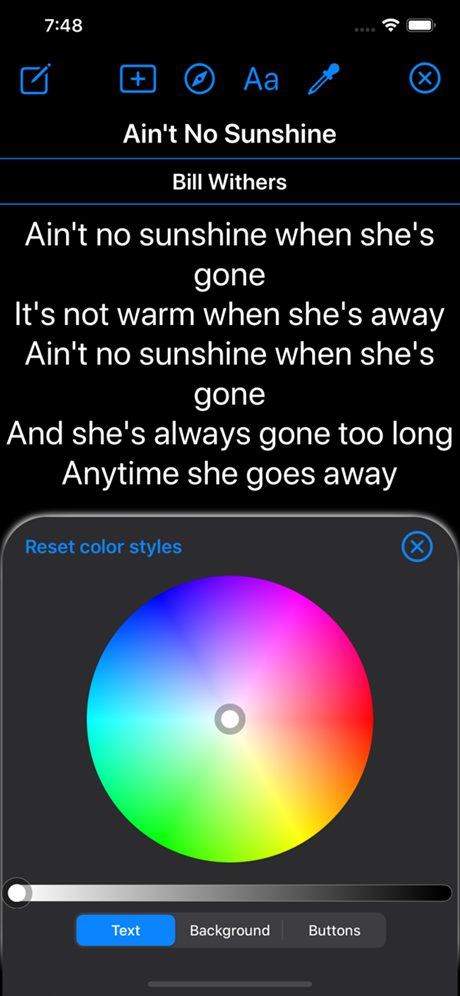 Gardez vos paroles toujours avec vous. Naviguez facilement entre les chansons. Rechercher et réorganiser. Créer des listes de lecture. Sauvegarde automatique et manuelle sur votre stockage iCloud. Paroles de sauvegarde également au format .txt. Choisissez vos couleurs et polices personnalisées.