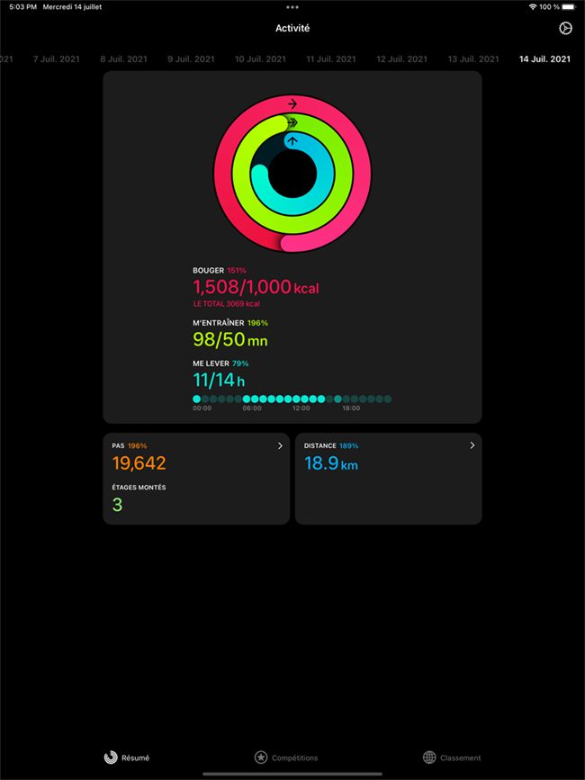 Complétez vos anneaux même si vous n’avez pas d’Apple Watch ! Si vous avez une Apple Watch, cela vous intéresse peut-être d’entrer en compétition avec d’autres utilisateurs. Suivez vos pas, votre distance et votre activité. Recevez des notifications lorsque vous atteignez vos objectifs d’activité quotidiens. Partagez vos anneaux avec les résultats. Placez vos anneaux d’activité sur n’importe quelle image. Défiez d’autres utilisateurs et encouragez-les. Changez vos objectifs d’activité à votre guise : Bouger, M’entraîner, Me lever ou Pas. Consultez l’historique de vos exercices et comparez les résultats mois par mois. Plusieurs statistiques sont disponibles pour chaque exercice.