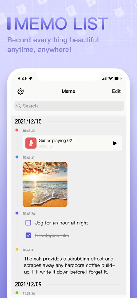 Conservez les mots, les images, les vidéos, la voix et les positions que vous souhaitez enregistrer à tout moment et n’importe où. Et il y a des rappels que vous ne pouvez jamais oublier.