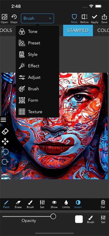 iColorama est une application de créativité pour les personnes désireuses d’améliorer leurs photos et de les convertir en œuvres d’art étonnantes. Il y a trop d’effets pour être listés ici, plus de 300 ! Les effets vont de simples ajustements d’image à des transformations compliquées. Les images peuvent également être repeintes avec de nombreux pinceaux différents et vous pouvez importer et utiliser directement vos propres pinceaux Photoshop !