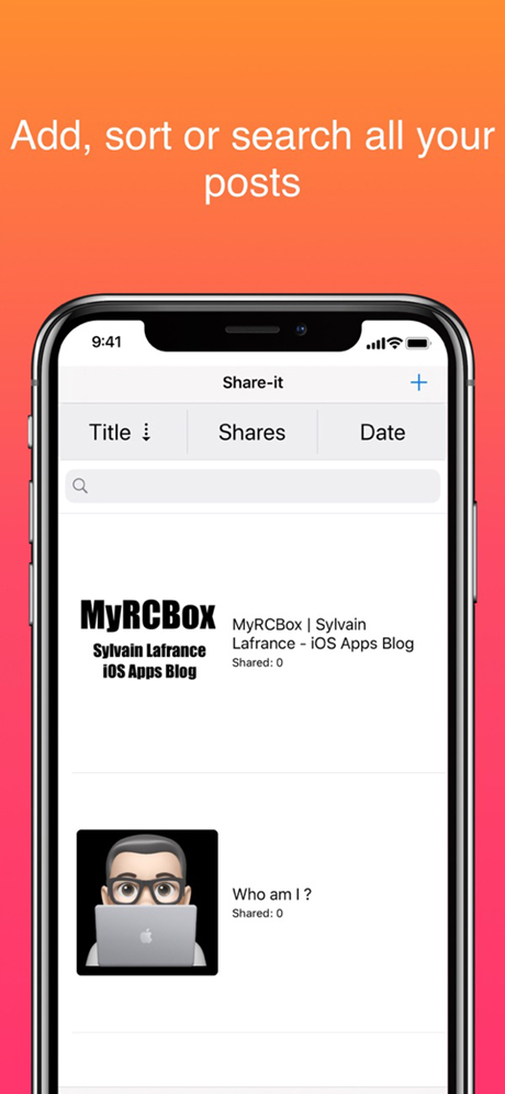 Share-it rend les blogs beaucoup plus faciles, pas besoin de souscrire à des services ou des abonnements tiers. Partagez vos publications quand vous le souhaitez ! Partagez rapidement vos messages sur le Web. La meilleure application pour les blogueurs et les gestionnaires de contenu ! Vous pouvez importer vos messages à partir du flux RSS de votre blog ou vous pouvez ajouter manuellement l’URL de vos messages à Share-it et vous êtes prêt à partir !