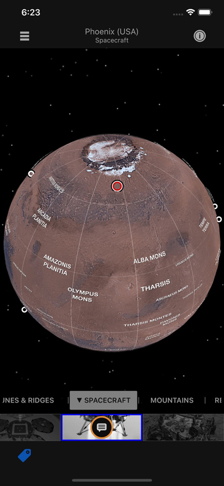 Explorez Mars à l’aide de gestes simples pour faire pivoter un globe, incliner, zoomer et sélectionner des emplacements. Caractéristiques : possibilité d’identifier environ 80 zones les plus intéressantes sur la carte de Mars, y compris les volcans, les cratères, les plaines, les montagnes, les engins spatiaux, affichage de certaines informations sur l’emplacement, telles que son nom, son type, sa courte description, sa taille et ses coordonnées, possibilité de sélectionner des emplacements sur le globe 3D et sur la liste simple et zoom, rotation, inclinaison du globe.