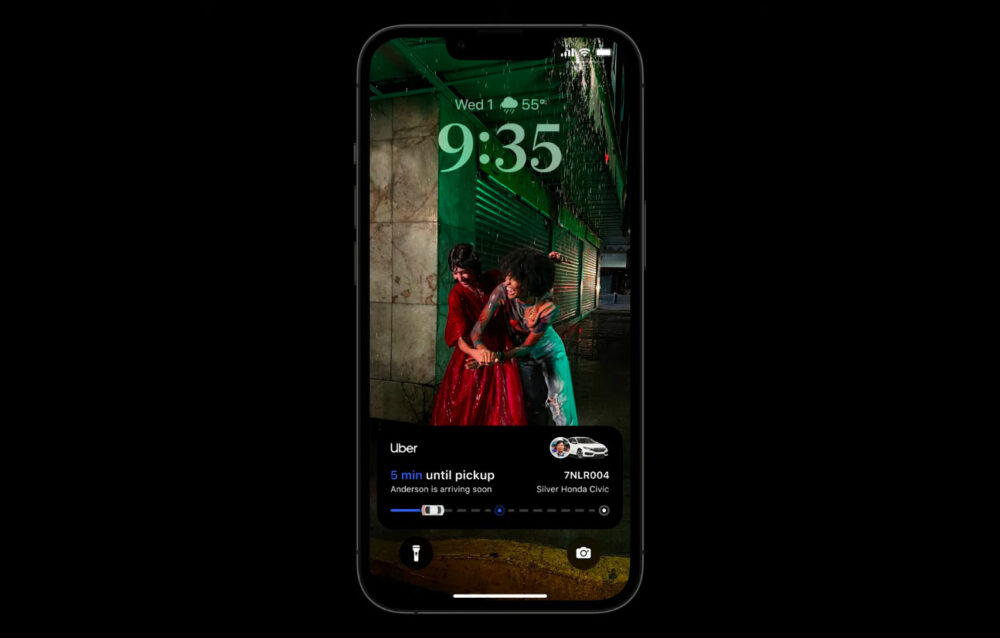 Pour plus d’ « épuration » et de simplicité, les notifications n’occupent plus désormais tout l’écran de verrouillage ; ils apparaissent tous en bas de l’écran avec la possibilité de les cacher durant la journée. Quant à la fonctionnalité Live Activities (Activités en direct), elle aide les utilisateurs à rester au courant de ce qui se passe en temps réel, comme un match de sport, un entraînement, une commande de course ou une commande de livraison de nourriture, directement depuis l’écran de verrouillage. Par exemple, l’application Uber peut afficher le temps d’attente restant avant l’arrivée de votre chauffeur.