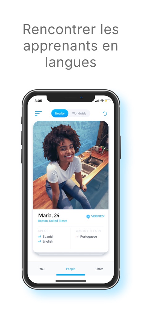 Entrez en contact avec des apprenants en langues situés près de vous pour pratiquer librement une langue étrangère! Apprenez des langues par le biais de conversations. Passez un bon moment en rencontrant de nouvelles personnes venant de différentes cultures et de différents horizons. Voyez-vous régulièrement pour être plus à l’aise à l’oral. Quelle que soit la langue que vous parlez, connectez-vous instantanément grâce à l’application et commencez à chatter.