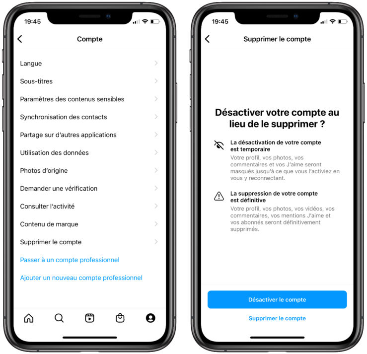 Si vous voulez supprimer votre compte Instagram, ouvrez l’application sur votre iPhone, votre iPad ou sur vote iPod touch, puis sur votre profil, touchez les trois barres horizontales en haut à droite et rendez-vous dans Paramètres > Compte > Supprimer le compte. Ensuite, vous verrez l’option Supprimer le compte en bas celle pour Désactiver le compte.