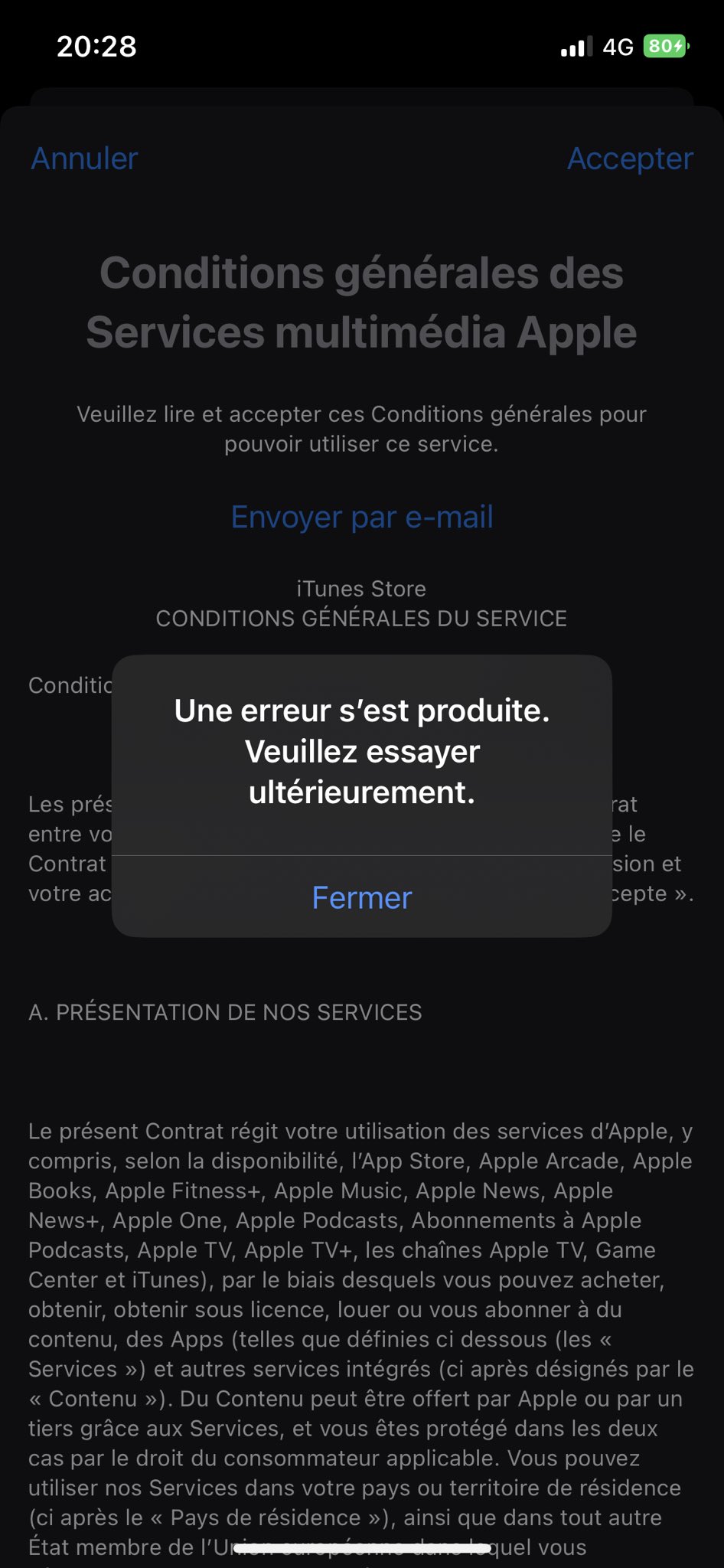 De nombreux utilisateurs sur Twitter ont annoncé qu’ils ont le problème de leur côté. Ils expliquent que le fait d’accepter les conditions générales de l’App Store, une fenêtre apparaît et présente l’erreur suivante : « Une erreur s’est produite. Veuillez réessayer ultérieurement ». Dans ce cas, il devient par conséquent impossible d’installer des applications ou d’installer des mises à jour.