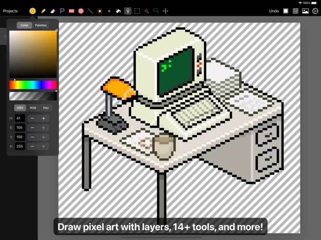 Pixen est un éditeur de pixel art professionnel conçu pour travailler avec de l’art raster à basse résolution, comme ces sprites 8 bits que l’on trouve dans les jeux vidéo de la vieille école. Avec des fonctionnalités telles qu’un système de palette de couleurs unique, des calques et une prise en charge du zoom élevé, Pixen regroupe tous les outils dont les artistes de pixels ont besoin dans une interface intuitive native pour iPad. Pixen rend également la création d’animations image par image amusante et facile.