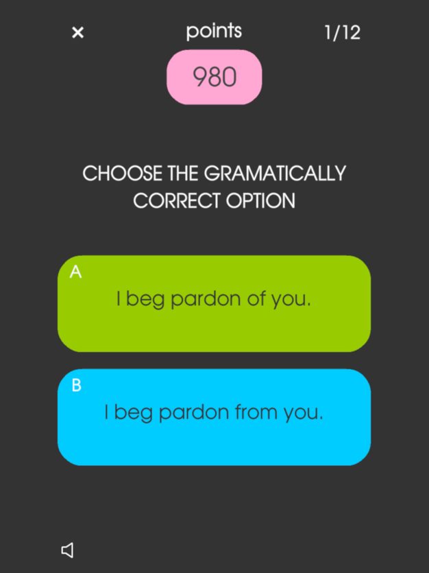 Test and improve your English grammar skills in My English Grammar Test PRO! Will you make it into TOP20 highscores? How to play: There will be 2 options shown on the screen, choose the grammatically correct one as fast as possible. Your final score depends on your speed and on the number of mistakes that you make! Don’t like a timed challenge? Try then our practice mode! Play and learn English grammar at the same time!