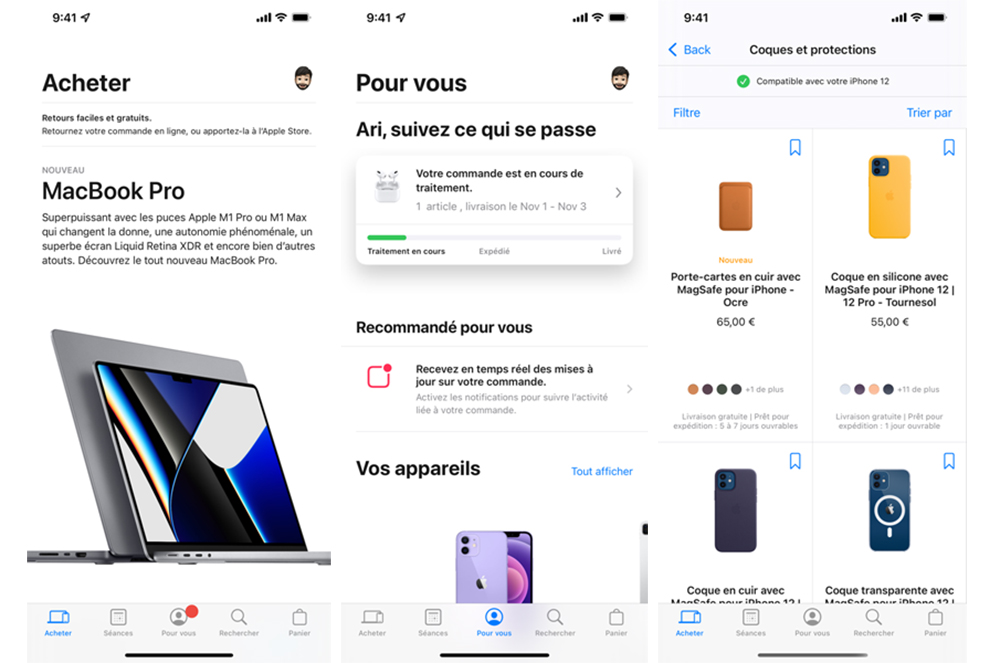 « L’app Apple Store, c’est une façon plus personnelle de se procurer les tout derniers produits et accessoires Apple. Obtenez des recommandations en fonction des produits Apple que vous possédez déjà. Trouvez quels accessoires sont compatibles avec vos appareils. Remplacez facilement votre iPhone par un modèle plus récent. Suivez l’état de votre commande, où que vous soyez. Et inscrivez-vous à des séances pratiques dans les Apple Store. Vous pouvez même utiliser Apple Pay pour régler avec votre iPhone dans les Apple Store participants. »