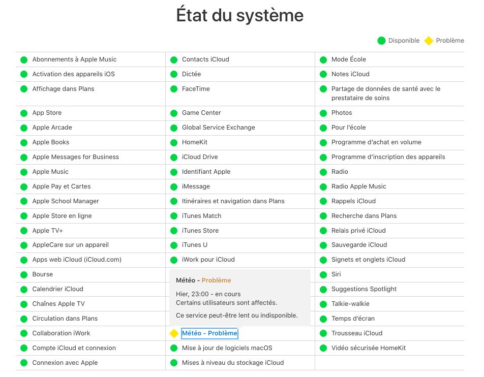 Le souci en question apparaît depuis hier. Sur sa page État du système, Apple indique que « Ce service peut être lent ou indisponible » et que « Certains utilisateurs sont affectés ». Les utilisateurs ne peuvent rien faire de leur côté sinon attendre qu’Apple corrige le souci.