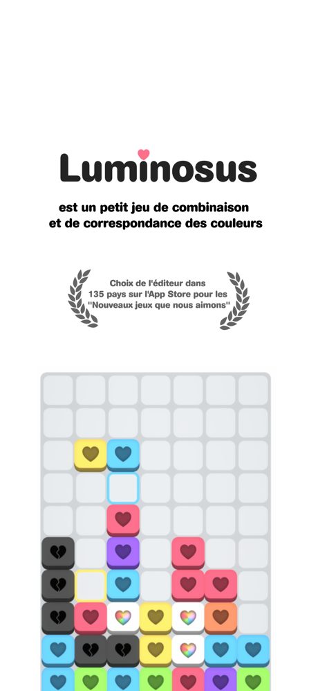 Luminosus est un jeu de puzzle unique et stimulant qui combine le plaisir de faire correspondre des couleurs sur un tableau Tetris. Les pièces de puzzle peuvent être changées en arrière et en avant autant de fois que vous le souhaitez, de sorte qu’un bloc rouge changera une pièce jaune en orange, mais une autre pièce rouge la changera de nouveau en rouge. Si une pièce est influencée par les trois couleurs, elle devient blanche et marque significativement plus de points lorsqu’elle est effacée. De cette façon, le jeu nécessite de planifier plus de mouvements à l’avance que votre jeu de puzzle standard de chute de pièces. Avec son gameplay simple mais addictif, Luminosus offre des heures de divertissement et une variante de l’expérience classique de Tetris et Puyo.