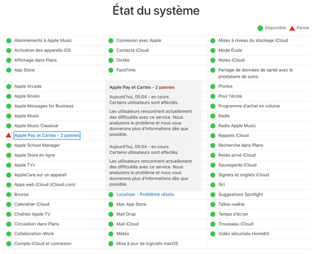 En se rendant sur son site d’état du système, Apple explique que la panne qui concerne Apple Pay a démarré depuis plusieurs heures maintenant. Le constructeur indique : « Certains utilisateurs sont affectés. Les utilisateurs rencontrent actuellement des difficultés avec ce service. Nous analysons le problème et nous vous donnerons plus d’informations dès que possible ».